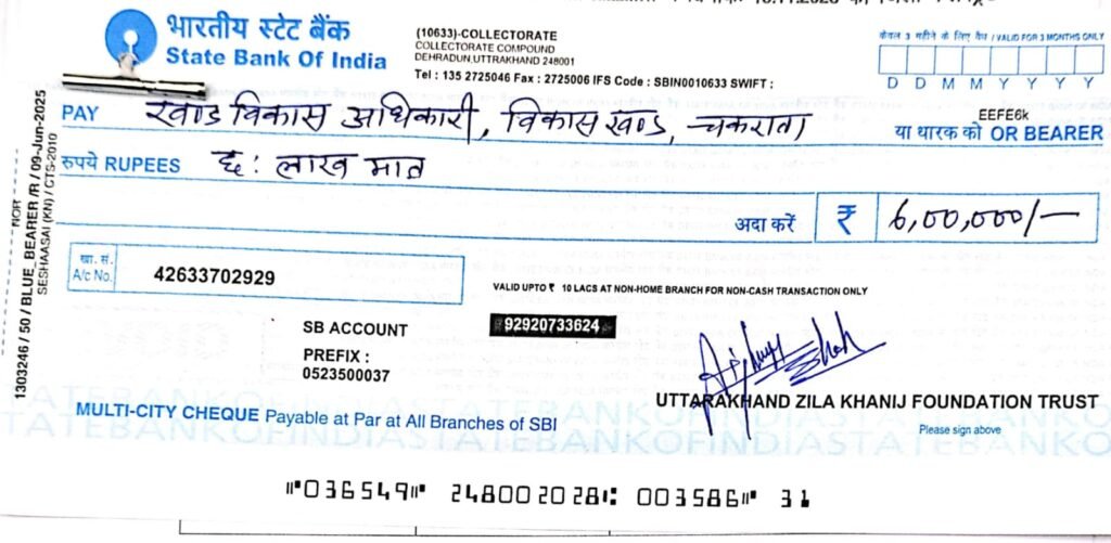 शासी परिषद के अध्यक्ष एवं अन्य सदस्यों द्वारा प्रस्ताव पर अनुमोदन प्रदान करते हुए कुल रु० 10.00 लाख (रुपये दस लाख मात्र) की स्वीकृति दी गई है, जिसमें से 60 प्रतिशत अर्थात० रु 6,00,000/- (रुपये छः लाख मात्र) की धनराशि प्रथम किस्त के रूप में खण्ड विकास अधिकारी, विकासखण्ड चकराता को निर्गत किए जाने हेतु जिला खनिज फाउंडेशन न्यास के निर्धारित बैंक खाते से चैक तैयार किया गया है। शेष 40 प्रतिशत अर्थात रु० 4,00,000/- (रुपये चार लाख मात्र) की धनराशि उपयोगिता प्रमाण पत्र प्रस्तुत किए जाने एवं तृतीय पक्ष द्वारा जाँच आख्या प्राप्त होने के उपरान्त निर्गत की जाएगी।