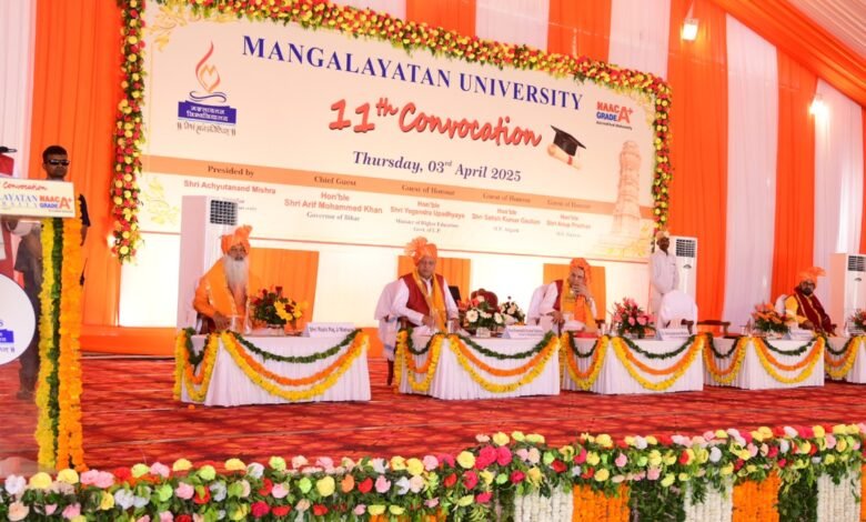 अलीगढ़: मंगलायतन विश्वविद्यालय के 11वें दीक्षांत समारोह में बिहार के राज्यपाल आरिफ मोहम्मद खान ने शिरकत की और उन्होंने विद्यार्थियों को भविष्य के लिए शुभकामनाएं देते हुए देश के विकास में योगदान देने के लिए प्रेरित किया। शिक्षा के महत्व पर जोर देते हुए कहा कि आज के युग में यह एक शक्तिशाली उपकरण है जो व्यक्तियों और समाज को प्रगति की ओर ले जाता है। विद्यार्थियों को लगातार सीखने और अपने ज्ञान का उपयोग मानवता की सेवा में करने के लिए प्रोत्साहित किया। उन्होंने गुरु को श्रद्धा का अधिकारी बताते हुए कहा कि दुनिया में सिर्फ माता-पिता व गुरु चाहते है उनका बच्चा उन्हें पीछे छोड़कर आगे निकले। श्रद्धा जितनी ज्यादा होगी उतना ही ज्ञान अर्जन में आसानी होगी। विद्या का एक उद्देश्य यह भी है कि हम सम्मान जनक जीवन बिता सकें और अर्थ पैदा कर सकें। जब अर्थ आएगा तो उससे धमार्थ के कार्य भी कर सकेंगे। उन्होंने पांडवों की कहानी सुनाते हुए धर्म व रिलीजन के अलग-अलग होने का अर्थ बताया। उन्होंने कहा कि शिक्षा देने का कार्य सबसे बड़ा धर्म है, क्योंकि शिक्षा व्यक्ति व समाज के सशक्तिकरण के लिए है। विश्वविद्यालय में आकर जिसका दूसरा जन्म नहीं हुआ है, जिसने मानस का विस्तार नहीं किया है तो आप सिर्फ साक्षर हो गए हैं, शिक्षित नहीं हुए। शिक्षा का फल बताते हुए बताया कि जो हम विद्या प्राप्त करते हैं उसे धारण करके तेज का रूप धारण करना चाहिए। समाज व देश को आलोकित करे तभी विद्या का वास्तविक उद्देश्य पूरा होता है। उन्होंने बात कला को प्रखर करने व कर्म का मर्म बताते हुए कहा कि सही शब्दों का चयन और उसके माध्यम से अपनी बात कहना कर्म है। यदि आप सही शब्दों का प्रयोग नहीं करते तो इसका मतलब यह है कि आप समस्या को समझते ही नहीं है। जब समझेंगे तो नहीं तो समाधान कहां से लाएंगे। संस्कार व संस्कृति के पहली पाठशाला मां की गोद व पिता का संरक्षण होता है। हमारी संस्कृति व संस्कार नहीं मिटे भले ही परिस्थितियां विपरती रहीं हों। हजारों साल पहले जो आदर्श और मूल्य भारतवासियों को प्रेरित करते थे वह आज भी हमारे लिए प्रेरणा के स्त्रोत हैं। विधिविता व एकता ही भारतीय संस्कृति की पहचान है। हमारी संस्कृति हमें बताती है यह दुनिया विविधता से भरी हुई है। इसका सम्मान करना चाहिए। जो इस वास्तविकता को नहीं देख पाएगा उसे कभी मोक्ष प्राप्त नहीं होगा। भारतीय संस्कृति ही पूरी दुनिया को शांति का रास्ता दिखा सकती है।