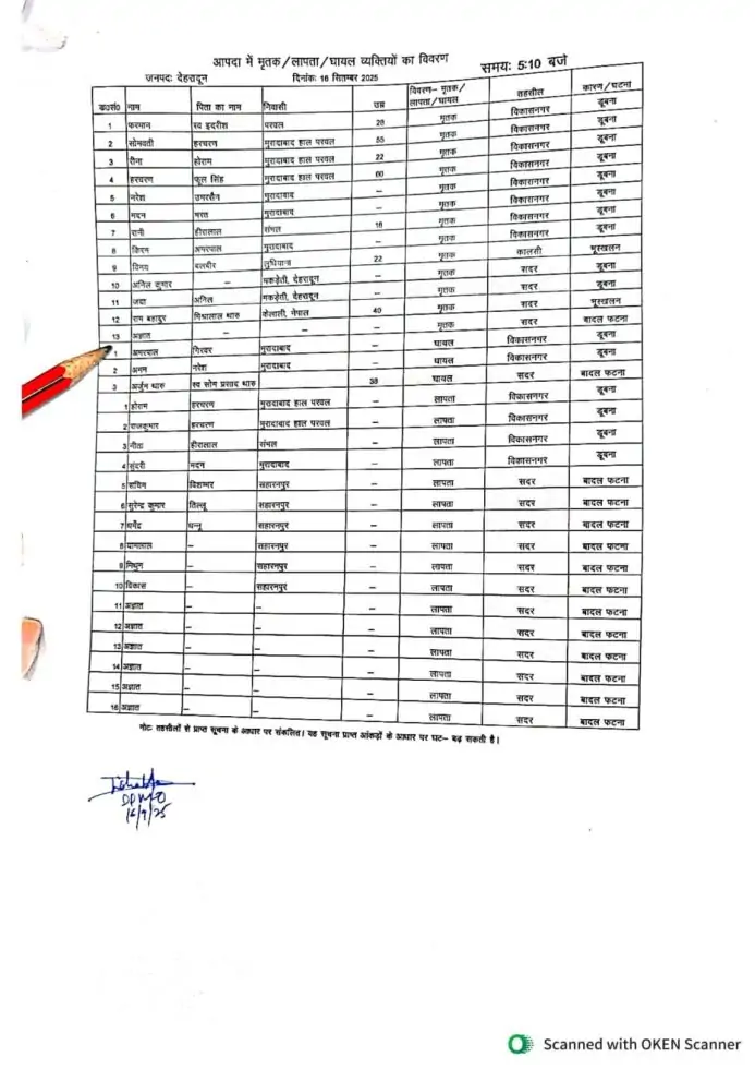 देहरादून: अतिवृष्टि के कारण देहरादून में 13 व्यक्तियों की मृत्यु हुई। तीन व्यक्ति घायल और 16 लापता हैं।
