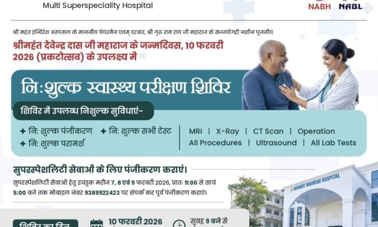 देहरादून: दरबार श्री गुरु राम राय जी महाराज के सज्जादे गद्दी नशीन एवं पूजनीय श्रीमहंत देवेन्द्र दास जी महाराज के जन्मदिवस (प्रकटोत्सव 10 फरवरी) के पावन अवसर पर श्री महंत इन्दिरेश अस्पताल, देहरादून द्वारा 10 फरवरी 2026 (मंगलवार) को एक विशाल निःशुल्क स्वास्थ्य परीक्षण शिविर का आयोजन किया जा रहा है, जिसे इस वर्ष सेवा दिवस के रूप में श्रद्धा, सेवा और समर्पण की भावना के साथ मनाया जाएगा। इस शिविर में जनरल चिकित्सा सेवाओं के साथ-साथ सभी सुपरस्पेशलिटी सेवाएं भी पूर्णतः निःशुल्क उपलब्ध कराई जाएंगी। शिविर के लिए पंजीकरण सुबह 08 बजे से प्रारंभ होगा, जबकि मरीज सुबह 09 बजे से दोपहर 03 बजे तक स्वास्थ्य सेवाओं का लाभ ले सकेंगे।