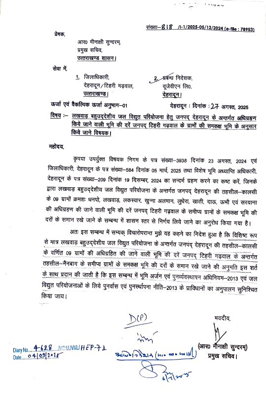 जिलाधिकारी सविन बंसल की अध्यक्षता में हुई बैठक में ग्रामीणों ने मुआवजा दरों में असमानता पर आपत्ति जताई थी। इसके बाद प्रशासनिक समिति ने समीक्षा कर प्रस्ताव शासन को भेजा था, जिसे हरी झंडी मिल गई। इस निर्णय से धनपो, लखवाड़, लकस्यार, खुन्ना अलमान, लुधेरा, खाती, दाऊ, ऊभौ और सरयाना गांवों के प्रभावित परिवारों को सीधा लाभ मिलेगा।