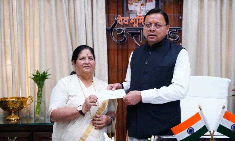 देहरादून: प्रसिद्ध पर्वतारोही एवं पद्मभूषण सम्मान प्राप्त बछेंद्री पाल ने शनिवार को मुख्यमंत्री राहत कोष के लिए 10 लाख रुपए का चेक प्रदान किया। यह चेक उनकी ओर से राज्य महिला उद्यमिता परिषद की उपाध्यक्ष श्रीमती विनोद उनियाल द्वारा मुख्यमंत्री को सौंपा गया।