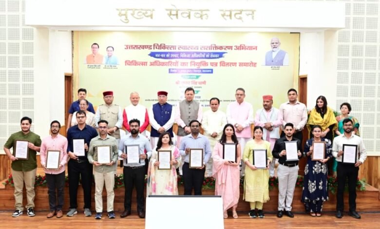 देहरादून: मुख्यमंत्री पुष्कर सिंह धामी ने उत्तराखंड चिकित्सा स्वास्थ्य सशक्तिकरण अभियान के तहत 220 नव नियुक्त चिकित्सा अधिकारियों को नियुक्ति पत्र वितरित किए। इस दौरान मुख्यमंत्री ने नवनियुक्त चिकित्सकों को शुभकामनाएं देते हुए इस क्षण को उनके जीवन का महत्वपूर्ण पड़ाव बताया। कहा कि आप मात्र चिकित्सक नहीं बल्कि देवभूमि के आरोग्य प्रहरी भी हैं। इसीलिए आप सभी को प्रदेश की चिकित्सा को सस्ती, जनसुलभ और नई ऊंचाइयों पर ले जाने के लिए पूर्ण समर्पण और सेवाभाव से कार्य करना होगा।