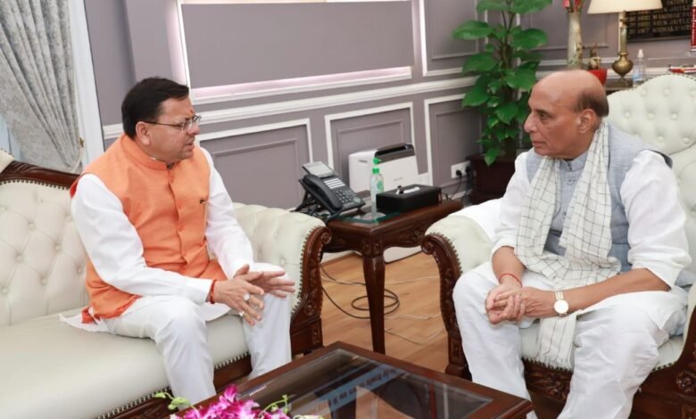 देहरादून/नई दिल्ली: मुख्यमंत्री पुष्कर सिंह धामी ने मंगलवार को नई दिल्ली में केंद्रीय रक्षा मंत्री राजनाथ सिंह से भेंट कर राज्य से जुड़े महत्वपूर्ण विषयों पर चर्चा की। मुख्यमंत्री ने केन्द्रीय रक्षा मंत्री से रानीखेत और लैंसडाउन छावनी क्षेत्र को नगर पालिकाओं के साथ विलय करने का अनुरोध किया। जिससे इन क्षेत्रों में पर्यटन एवं जनसुविधाओं के समग्र विकास में सहयोग मिलेगा।