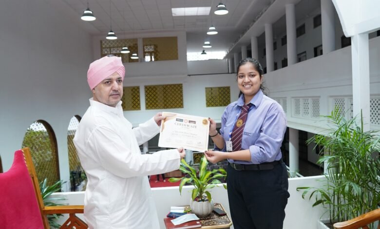 देहरादून: श्री गुरु राम राय विश्वविद्यालय के स्कूल ऑफ हयूमेनिटीज एंड सोशल सांइसेज की मेधावी छात्रा हंसिका सक्सेना ने भाषण प्रतियोगिता में उत्कृष्ट प्रदर्शन करते हुए श्री गुरु राम राय विश्वविद्यालय और उत्तराखण्ड की बेटियों का नाम रोशन किया। नई दिल्ली स्थित सबसे बडे और प्रतिष्ठित सभागार भारत मंडपम में 05 अगस्त 2025 को आयोजित ऑल इडिया युवा भाषण प्रतियोगिता में हंसिका सक्सेना ने अपनी प्रतिभा का लोहा मनवाया। उनकी इस उपलब्धि पर श्री गुरु राम राय विश्वविद्यालय के माननीय प्रेसिडेट श्रीमंहत देवेन्द्र दास जी महाराज ने हार्दिक बधाई एवं शुभकामनाए दी। शुक्रवार को श्री दरबार साहिब में आयोजित सम्मान कार्यक्रम श्रीमहंत देवेन्द्र दास जी महाराज ने हंसिका सक्सेना को 25,000 रू (पच्चीस हज़ार रुपये) का चैक दे कर सम्मानित किया। काबिलेगौर है कि भारत मंडपम मे आयोजित प्रतियोगिता में 150 से अधिक प्रतिभागियों ने पजींकरण कराया, जिनमे से केवल 20 वक्ताओ का चयन दो कठिन चरणों- जिसमे स्क्रिप्ट लेखन भी शामिल था के बाद किया गया।