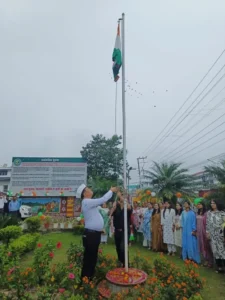 कार्यक्रम की अध्यक्षता एमडीडीए उपाध्यक्ष बंशीधर तिवारी ने की। तिरंगा फहराते ही परिसर देशभक्ति के नारों और “वन्दे मातरम्” की गूंज से भर उठा।