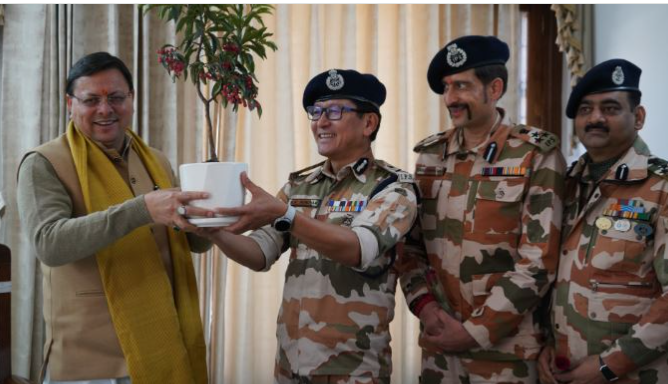 देहरादून: नववर्ष पर मुख्यमंत्री आवास में मुख्यमंत्री पुष्कर सिंह धामी से महानिरीक्षक आईटीबीपी संजय गुंज्याल एवं आईटीबीपी के अन्य वरिष्ठ अधिकारियों ने मुलाकात कर नव वर्ष की बधाई दी। मुलाकात के दौरान महानिरीक्षक आईटीबीपी ने समसामयिक विषयों पर चर्चा करते हुए हाल ही में सब्जियां/मांस व दूरस्थ वाइब्रेंट विलेज हेतु टेली मेडिसिन पहुंचाने हेतु उत्तराखण्ड सरकार के साथ हुए एम.ओ.यू. के बारे में जानकारी साझा की।