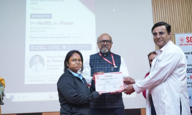 देहरादून: स्तन कैंसर जागरूकता माह के अंतर्गत, श्री गुरु राम राय विश्वविद्यालय के आंतरिक गुणवत्ता आश्वासन प्रकोष्ठ (IQAC) द्वारा पोस्टर मेकिंग प्रतियोगिता एवं अतिथि व्याख्यान का आयोजन किया गया। इस कार्यक्रम का उद्देश्य छात्रों और अध्यापकों में स्तन कैंसर के प्रति जागरूकता बढ़ाना और समय पर जाँच एवं आत्म-परीक्षण के महत्व को समझाना था।
