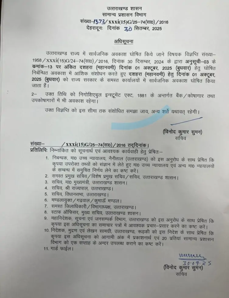 देहरादून: उत्तराखंड शासन ने अधिसूचना जारी कर 1 अक्टूबर 2025 (बुधवार) को दशहरा (महानवमी) के अवसर पर सार्वजनिक अवकाश घोषित किया है। पूर्व में इस दिन निर्बंधित अवकाश निर्धारित था, जिसे संशोधित कर अब पूर्ण सार्वजनिक अवकाश कर दिया गया है।