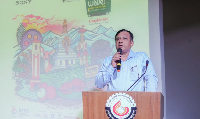 देहरादून: ग्राफिक एरा हिल यूनिवर्सिटी का माहौल फिल्म, संगीत और अभिव्यक्ति के रंगों से भर गया जब शॉर्ट फिल्म फेस्टिवल ‘‘वेव्स‘‘ की शुरुआत हुई। उत्तराखंड फिल्म डेवलपमेंट काउंसिल के सीईओ व आईएएस श्री बंशीधर तिवारी ने कहा कि आज के दौर में कंटेंट ही असली आधार है फिर चाहे वह सिनेमा हो, पत्रकारिता हो, या सोशल मीडिया।