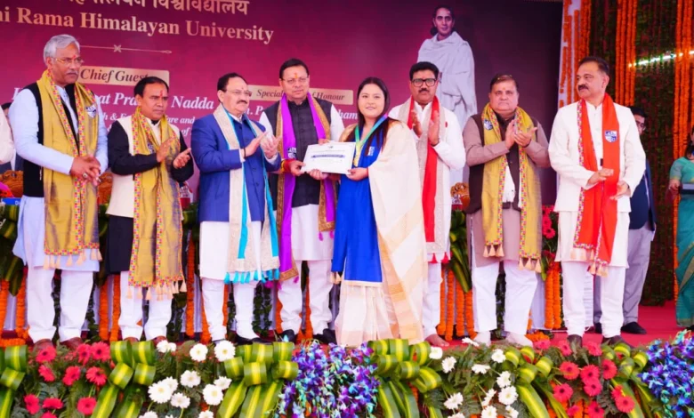 देहरादून: केंद्रीय स्वास्थ्य एवं परिवार कल्याण मंत्री तथा रसायन एवं उर्वरक मंत्री जेपी नड्डा और उत्तराखंड के मुख्यमंत्री पुष्कर सिंह धामी ने जॉलीग्रांट स्थित स्वामी राम हिमालयन विश्वविद्यालय के आठवें दीक्षांत समारोह में क्रमशः मुख्य अतिथि और विशिष्ट अतिथि के रूप में प्रतिभाग किया। केंद्रीय मंत्री ने विभिन्न संकायों में डिग्री प्राप्त करने वाले 1001 छात्र-छात्राओं को शुभकामनाएं देते हुए कहा कि यह दीक्षांत केवल एक शैक्षणिक पड़ाव नहीं, बल्कि जीवन की नई यात्रा की शुरुआत है। डिग्री के साथ मानव निर्माण और समाज के प्रति उत्तरदायित्व भी जुड़ा होता है। उन्होंने कहा कि अमृतकाल के अगले 25 वर्ष विकसित भारत के निर्माण के निर्णायक वर्ष होंगे, जिनमें आज के युवा साक्षी ही नहीं, कर्ताधर्ता भी बनेंगे। प्राप्त शिक्षा का उपयोग मानवता, गरीब और अंतिम पंक्ति में खड़े व्यक्ति के कल्याण के लिए करने का आह्वान उन्होंने किया। केंद्रीय मंत्री ने विश्वविद्यालय के अध्यक्ष डॉ. विजय धस्माना के नेतृत्व की सराहना करते हुए कहा कि संस्थान मानव सेवा, चिकित्सा और शिक्षा के क्षेत्र में नए कीर्तिमान स्थापित कर रहा है।