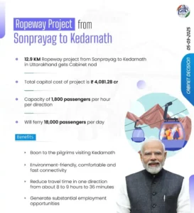 - पर्वतमाला परियोजना- उत्तराखंड के उच्च हिमालयी क्षेत्र में दो रोपवे पर केंद्र की हरी झंडी