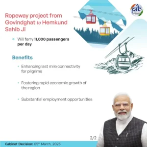 पर्वतमाला परियोजना के तहत उत्तराखंड राज्य में गोविंदघाट से हेमकुंड साहिब जी (12.4 किमी) तक रोपवे परियोजना के विकास को मंजूरी दी