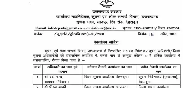 जारी कार्यालय आदेश के अनुसार सहायक निदेशक बद्री चंद को जिला सूचना कार्यालय देहरादून से सूचना निदेशालय (मुख्यालय) देहरादून में तैनात किया गया है। जिला सूचना अधिकारी धीरज कार्की को चंपावत से चमोली स्थानांतरित किया गया है, जबकि अनूज कुमार को चमोली से चंपावत भेजा गया है।